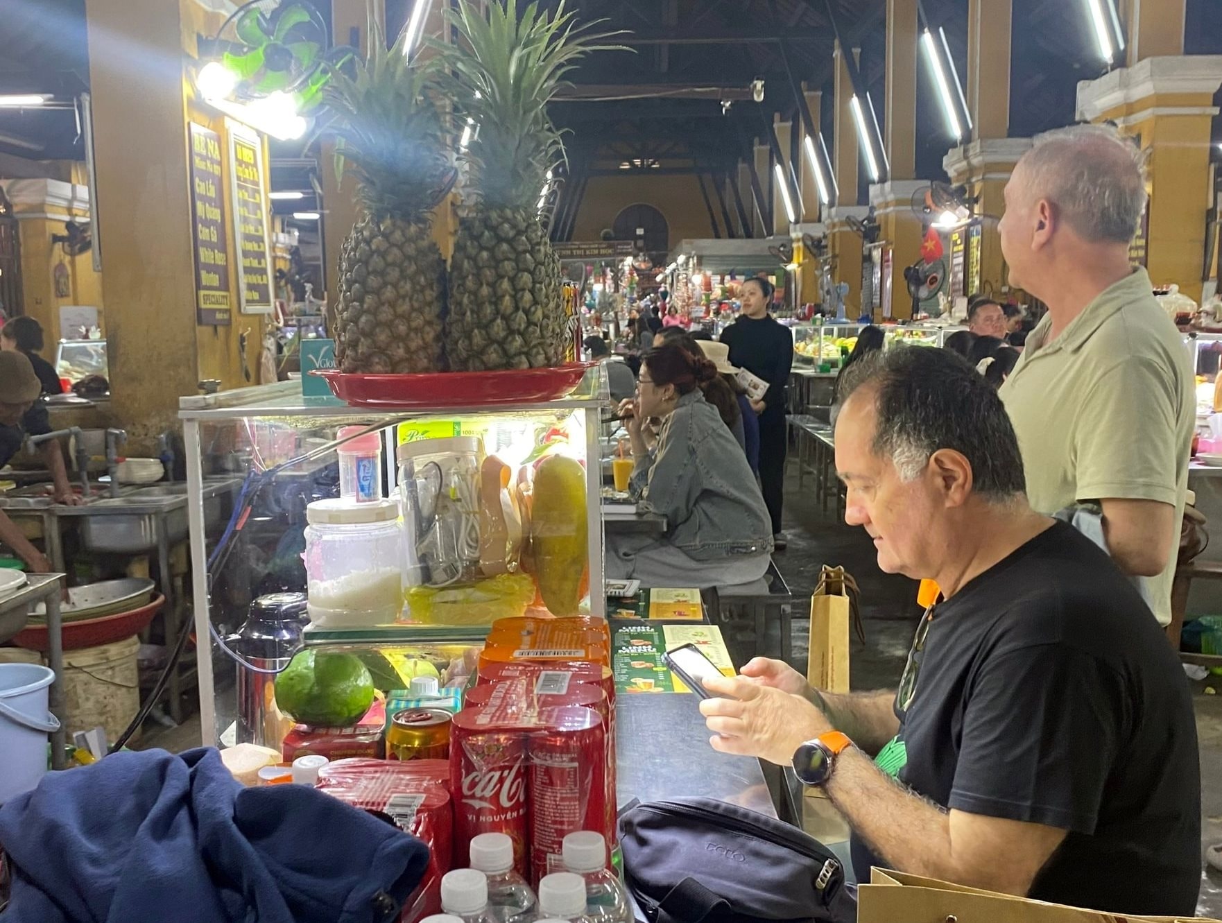 Du khách nước ngoài đến thưởng thức ẩm thực tại chợ Hội An