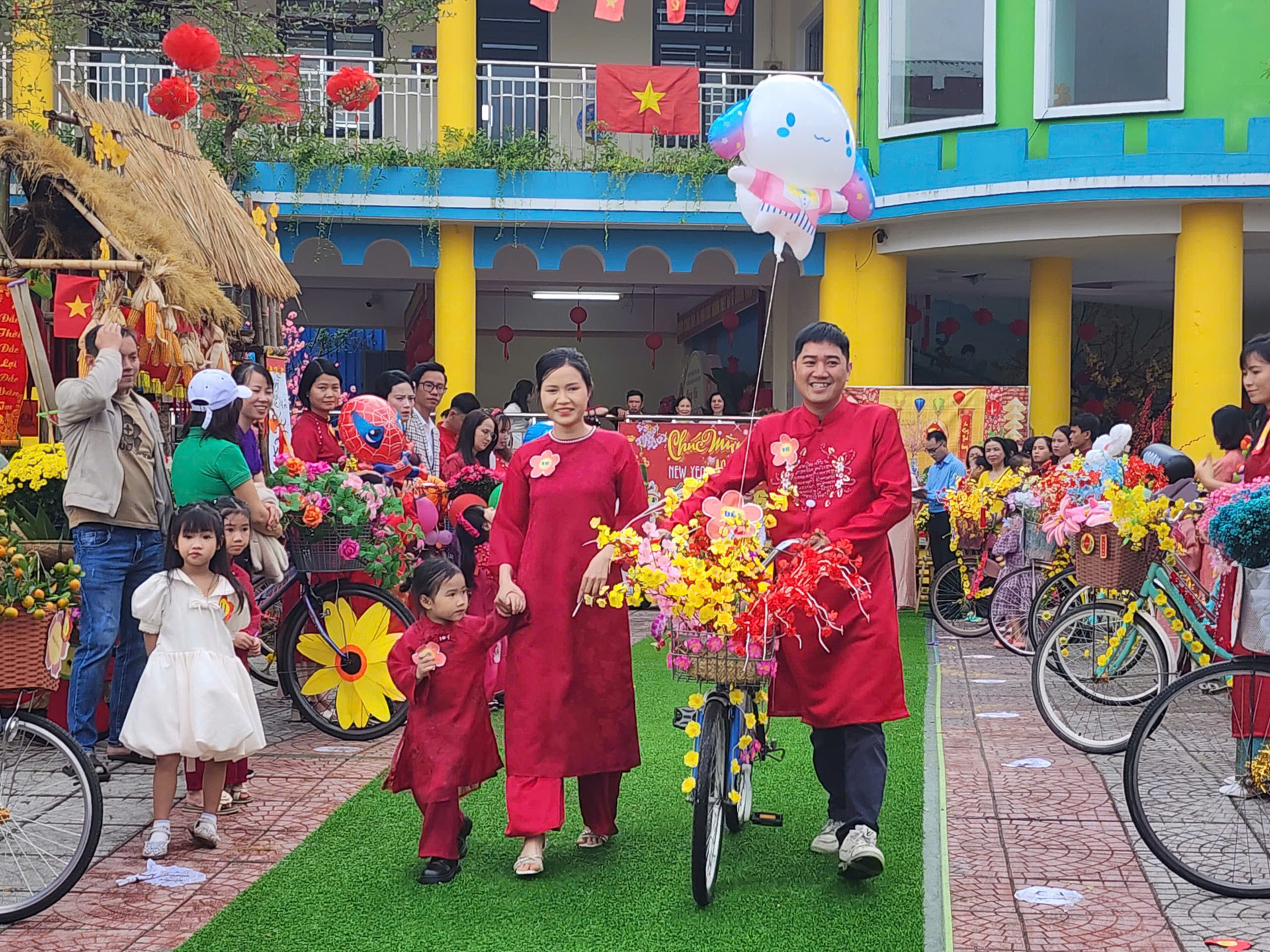 Phần thi trang trí xe đạp hoa ngày Tết thu hút phụ huynh, trẻ em tham gia.