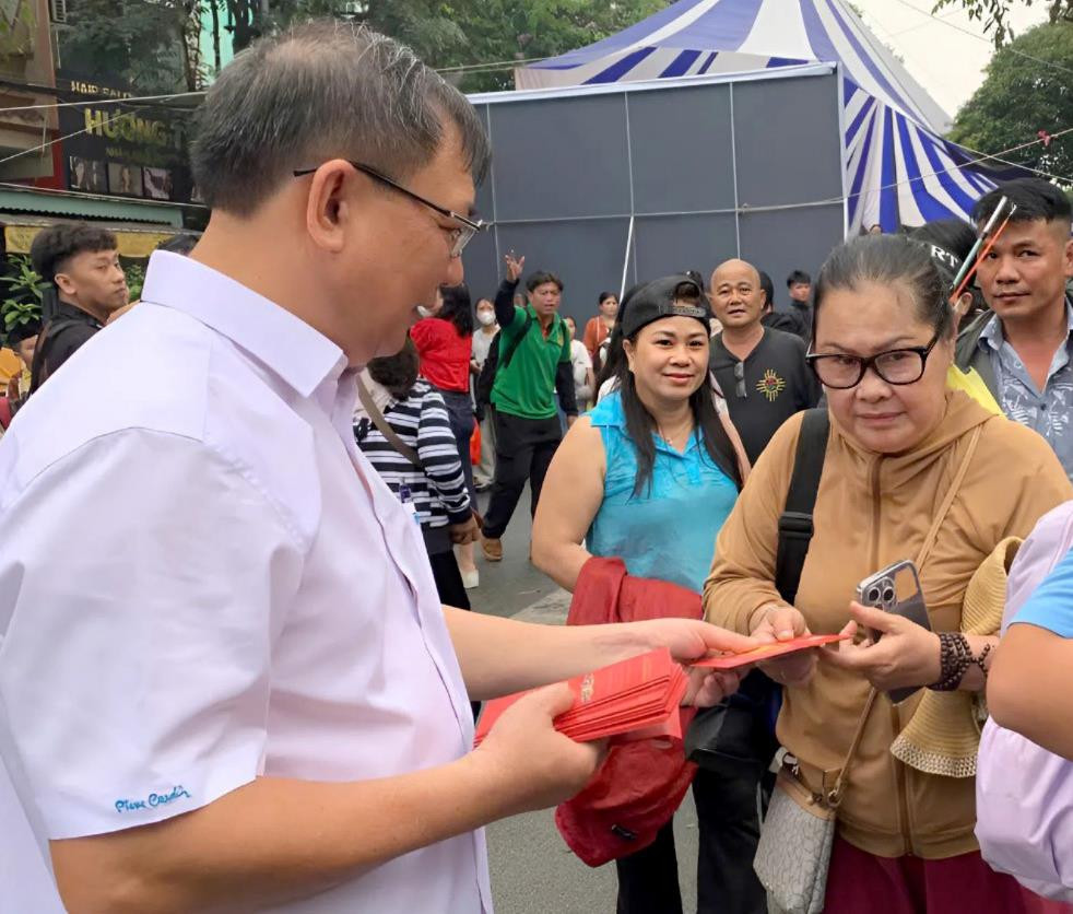 Ông Trần Hùng Phong (bên trái) lì xì cho người dân về quê đón Tết