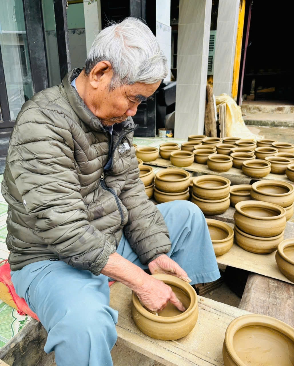 Trò chuyện cùng tôi, ông vừa sửa khô chiếc niêu đất vừa chia sẻ làm gốm trải qua 5 bước: làm đất, nặn, sửa khô, phơi nắng và đem nung.