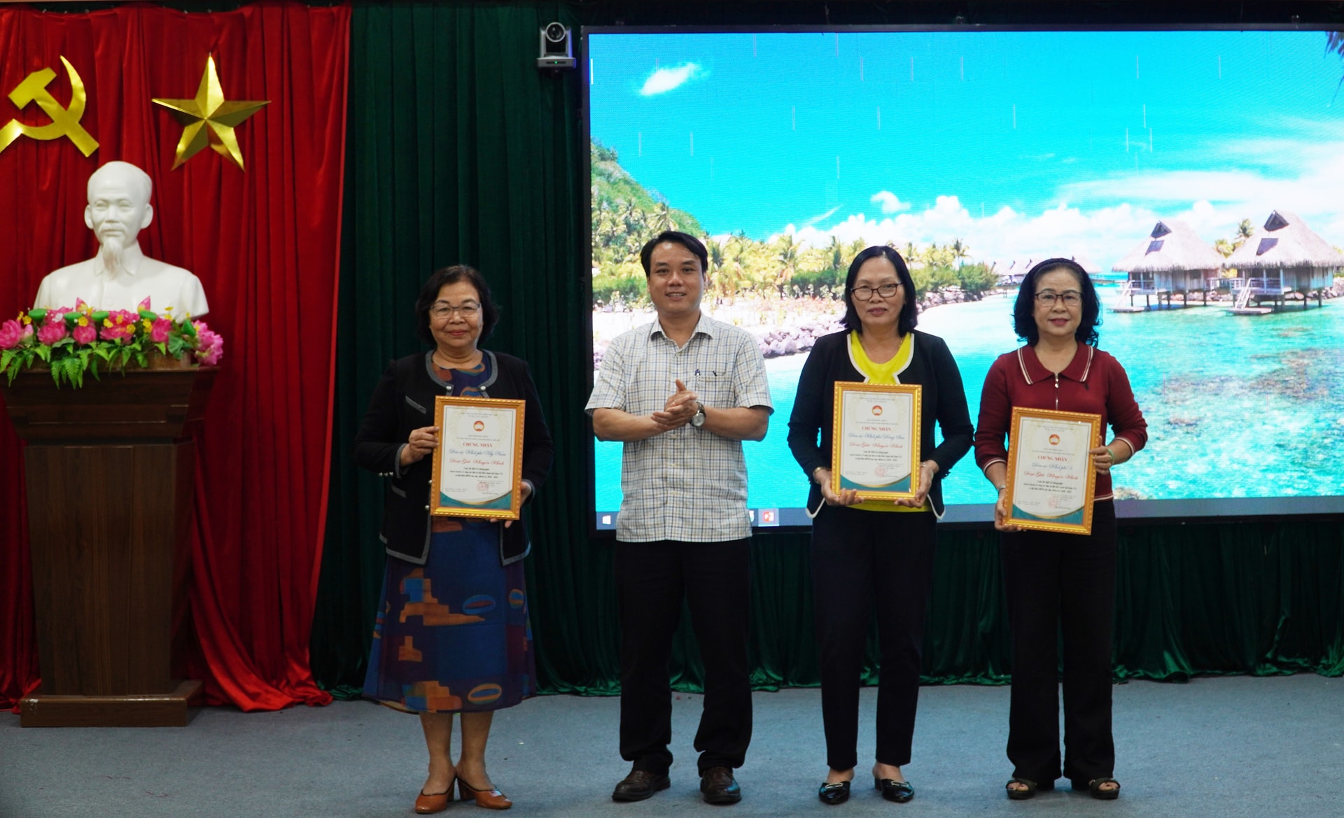 Đại diện lãnh đạo UBND phường Tam Kỳ trao thưởng cho các tác phẩm Infographic dự thi tuyên truyền bầu cử của các tổ dân phố. Ảnh: N.ĐOAN