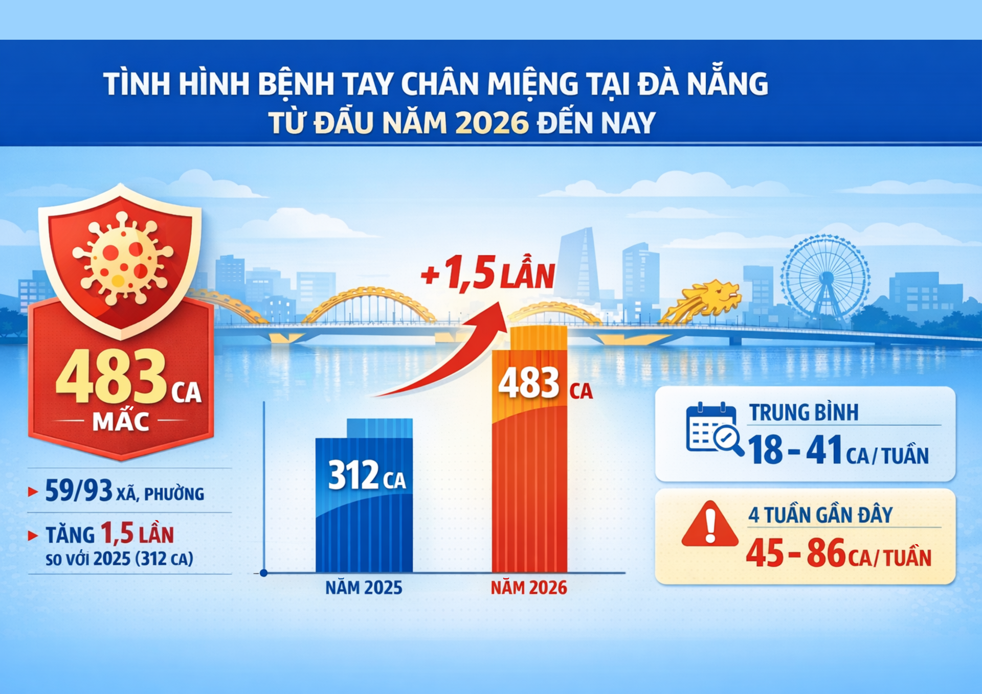 Theo Trung tâm Kiểm soát bệnh tật (CDC) thành phố Đà Nẵng, từ đầu năm 2026 đến nay, toàn thành phố ghi nhận 483 ca mắc tại 59/93 xã, phường, tăng 1,5 lần so với cùng kỳ năm 2025 (312 ca). Trung bình mỗi tuần ghi nhận từ 18 - 41 ca; riêng 4 tuần gần đây, số ca mắc dao động từ 45 - 86 ca/tuần, chưa có trường hợp tử vong.