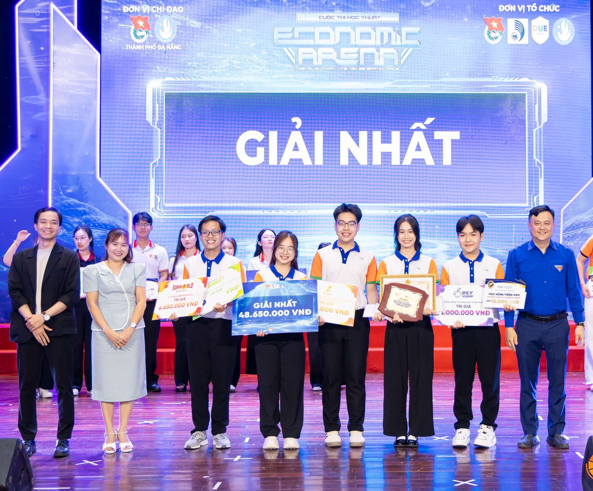 Ban tổ chức trao giải Nhất cho đội thi xuất sắc tại cuộc thi “Economic Arena” do Thành Đoàn - Hội Sinh viên thành phố phối hợp với Trường Đại học Kinh tế, Đại học Đà Nẵng tổ chức. Ảnh: KHÁNH NGÂN