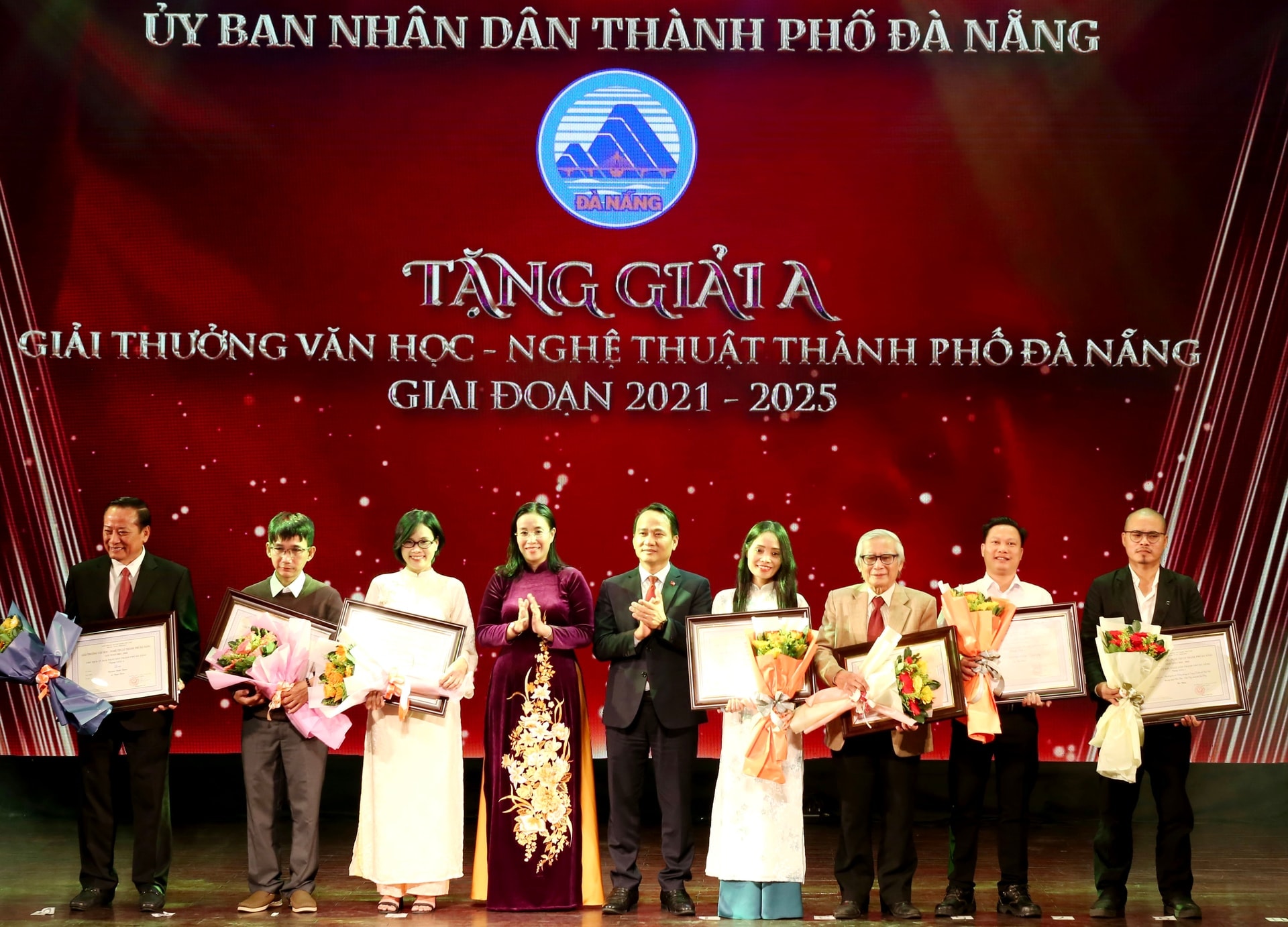 Phó Bí thư Thường trực Thành ủy Nguyễn Đình Vĩnh (thứ 5, bên phải sang) và Phó Chủ tịch UBND thành phố Nguyễn Thị Anh Thi (thứ 3, bên trái sang) trao giải A cho các tác giả xuất sắc nhất tại lễ trao Giải thưởng Văn học - Nghệ thuật thành phố Đà Nẵng, giai đoạn 2021 - 2025. Ảnh: TRỌNG HUY