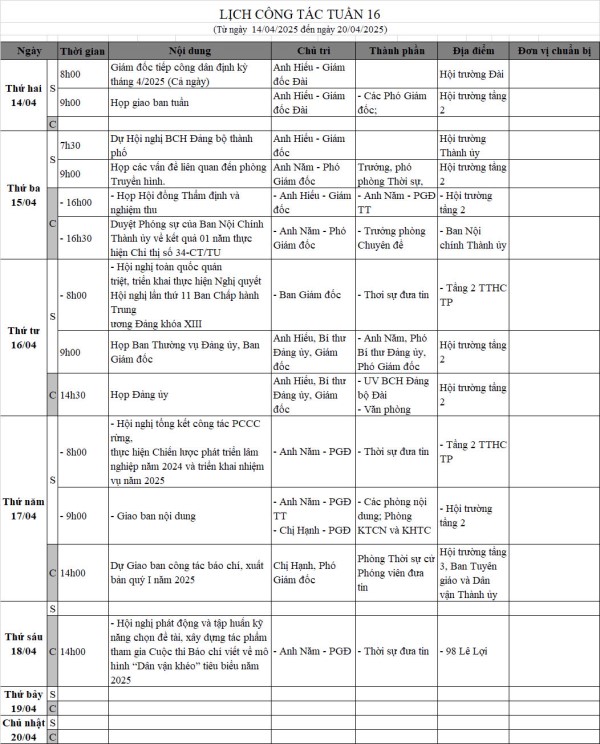 Lịch làm việc từ ngày 14/04/2025 đến ngày 20/04/2025