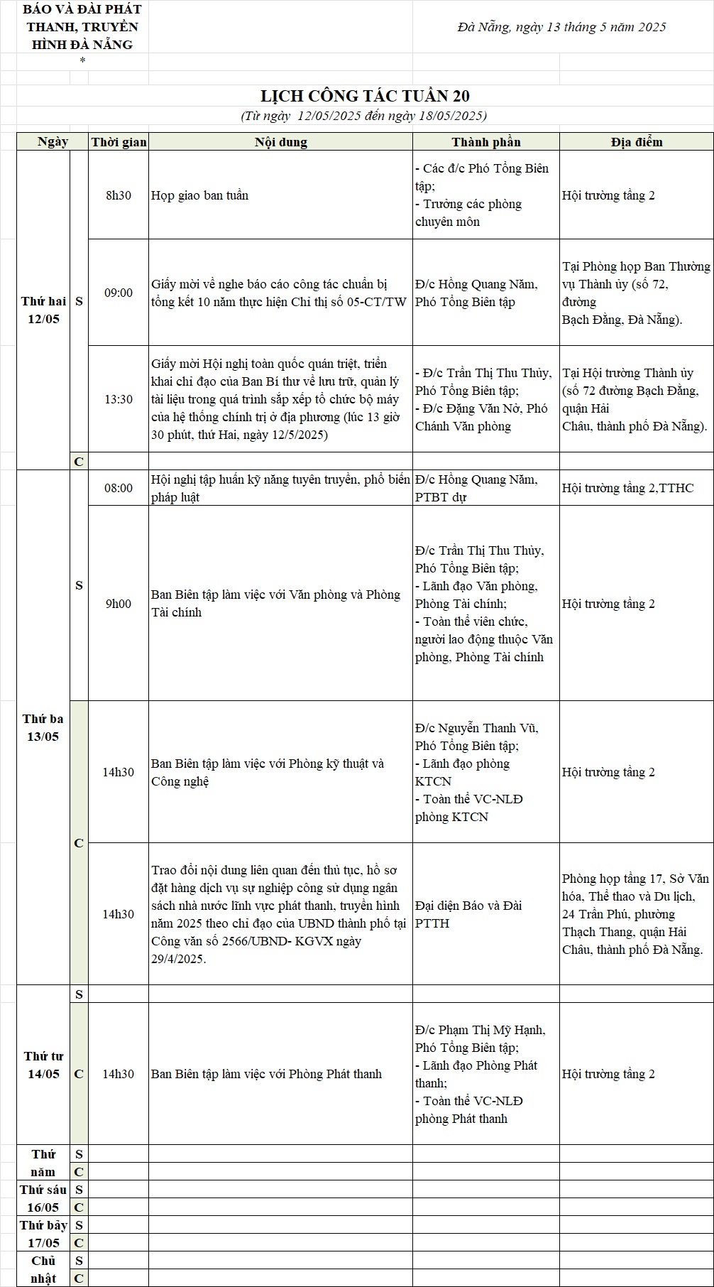 Lịch công tác từ ngày 12 tháng 5 đến ngày 18 tháng 5 năm 2025