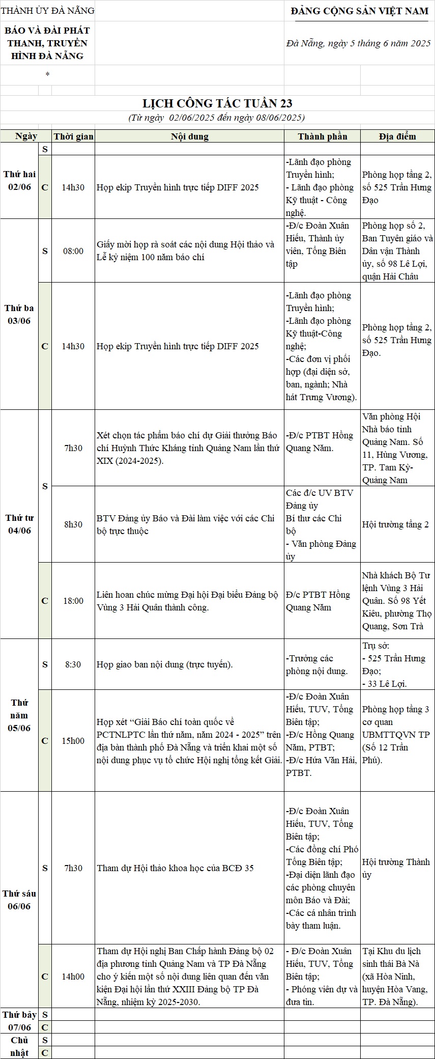 Lịch công tác từ ngày 02 tháng 6 đến ngày 08 tháng 6 năm 2025