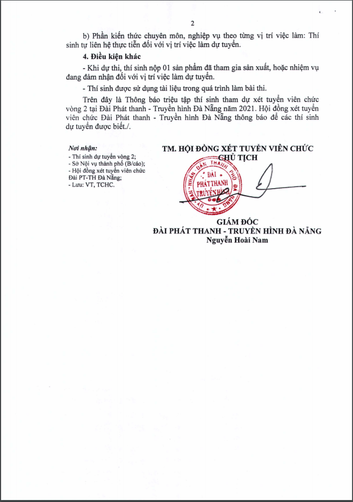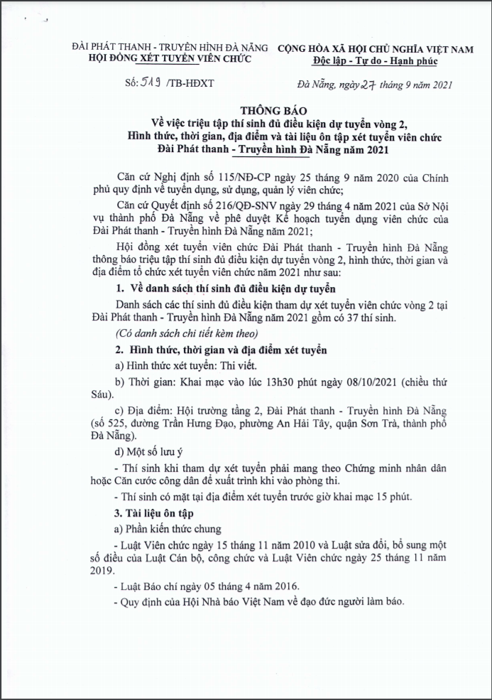 Danh sách các thí sinh đủ điều kiện tham dự xét tuyển viên chức vòng 2 tại Đài Phát thanh - Truyền hình Đà Nẵng năm 2021 gồm có 36 thí sinh.